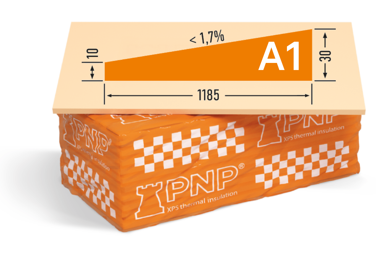 PNP XPS 150 SLOPE A1 (Rezistență la compresiune – 150 kPa) este o placă termoizolantă prefabricată, cu pantă calibrată cu precizie de 1,7%. Plăcile tip A1 și A2 sunt destinate formării pantei principale a acoperișurilor plate.