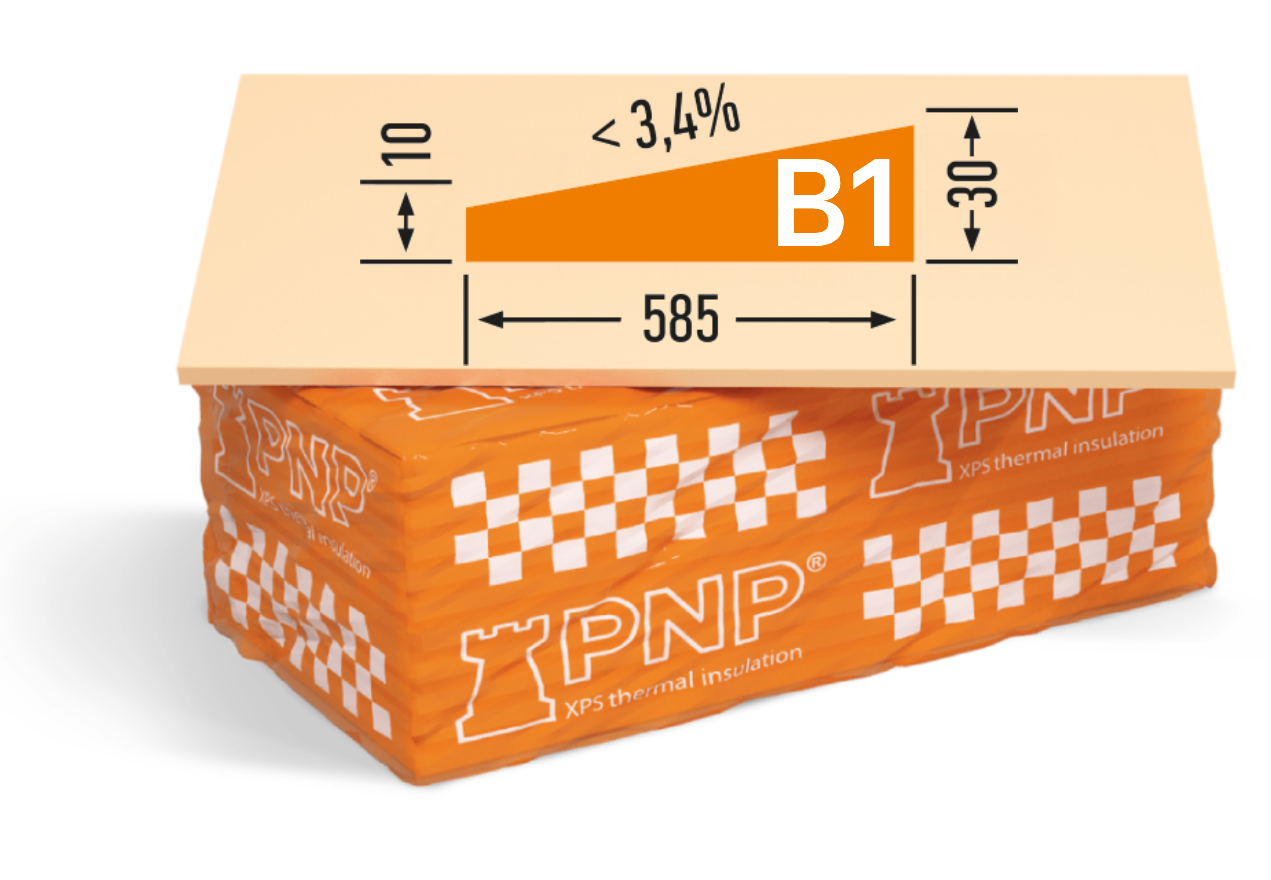 PNP XPS 150 SLOPE B1 (Rezistență la compresiune – 150 kPa) este o placă termoizolantă prefabricată, cu pantă calibrată cu precizie de 3,4%.